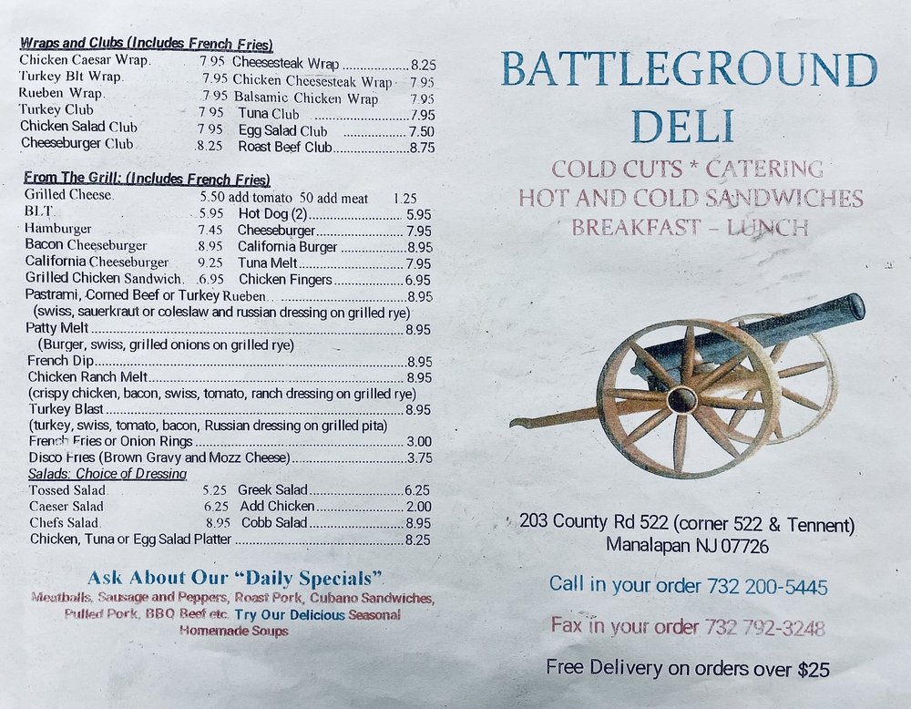 Located in Manalapan, NJ, Battleground Deli is a delightful haven for sandwich lovers seeking both comfort and flavor. This deli offers an impressive menu that caters to all tastes, featuring mouthwatering breakfast and brunch options alongside classic deli sandwiches. The cozy setting invites you to enjoy every bite, making it perfect for a casual meal or a quick takeaway.